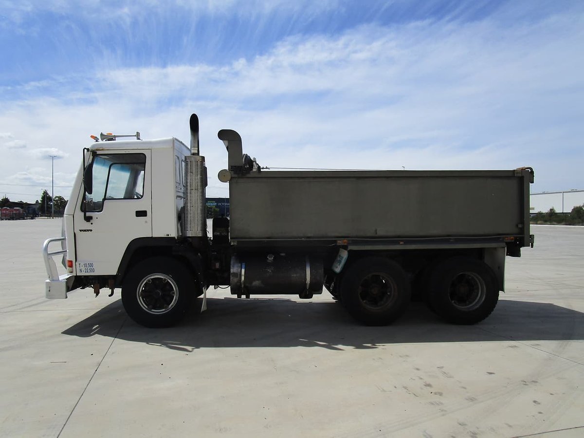 "1994 VOLVO FL10 6X4 STEEL TIPPER, VOLVO 6 CYL 10LT 320HP ENGINE, VOLVO 12 SPEED SYNCHRO TRANSMISSION, VOLVO SPRING SUSPENSION, ALLOY BULL BAR, FITTED WITH STEEL TIPPER AND 127MM BARTLETT TOW BAR, 10,260TARE, 26,000GVM, 44,000GCM. (SOLD AS TRADED- NO RWC)